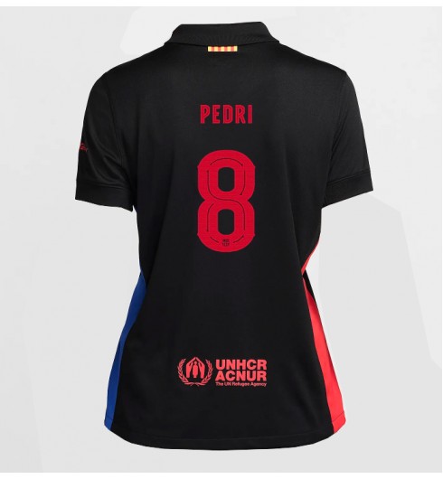Ženske gostujoči dres FC Barcelona 2024/25 ima ikonične blaugrana črte na elegantnem črnem ozadju, kar ustvarja vizualno osupljiv kontrast. Izstopajoč element je klubski grb, upodobljen kot značka TPU z odsevnim zaključkom, uokvirjen z modrimi in kostanjevimi obrisi. Ta izbira oblikovanja ni samo poklon barvam moštva, ampak daje najnovejši majici FCB tudi sodobno, v prihodnost usmerjeno estetiko.