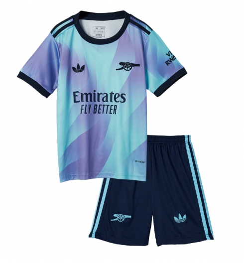 La terza maglia da calcio dell'Arsenal FC 24-25 è di colore blu acqua combinato con viola chiaro e blu navy. Il design della terza maglia da calcio dell'Arsenal FC 2024-25 è moderno in contrasto con il classico logo Trefoil. Presenta un moderno design sfumato che ricorda l'aurora boreale.